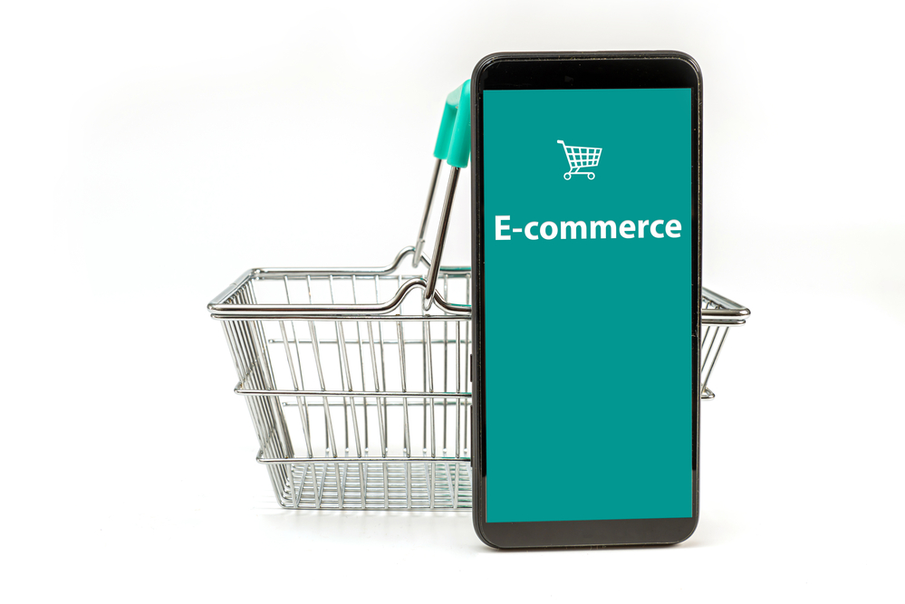 smartphone and small shopping basket isolated on white backgroun